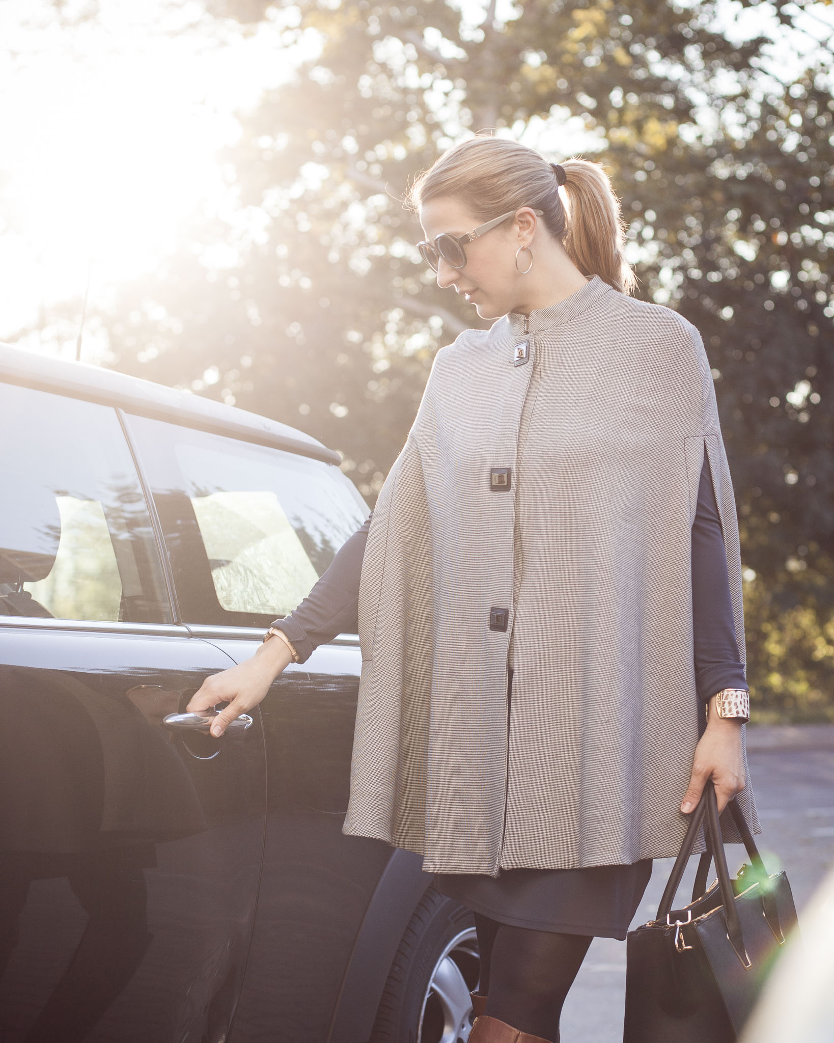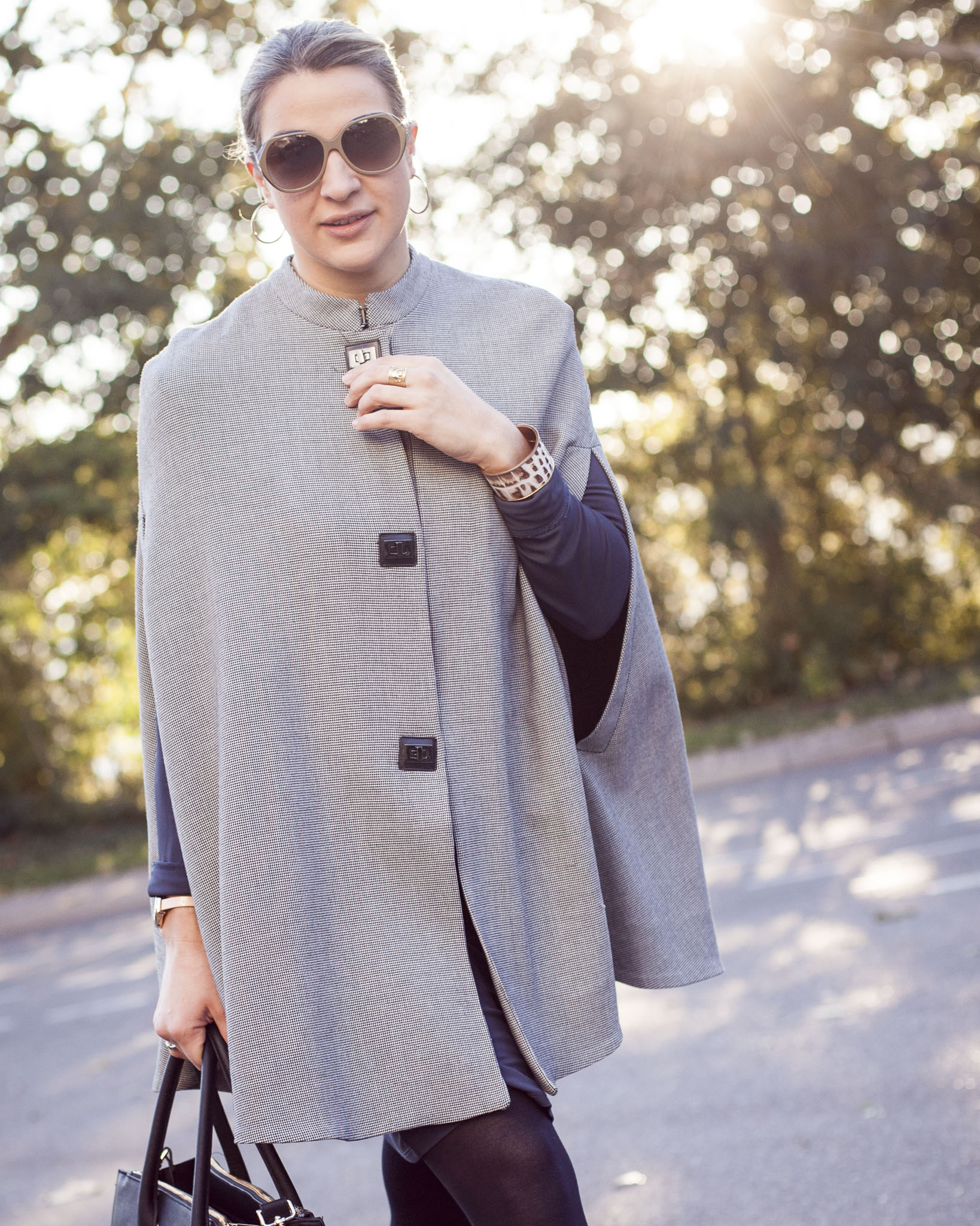 Cape: Mango, Tasche: H&M, Sonnenbrille: Carolina Herrera