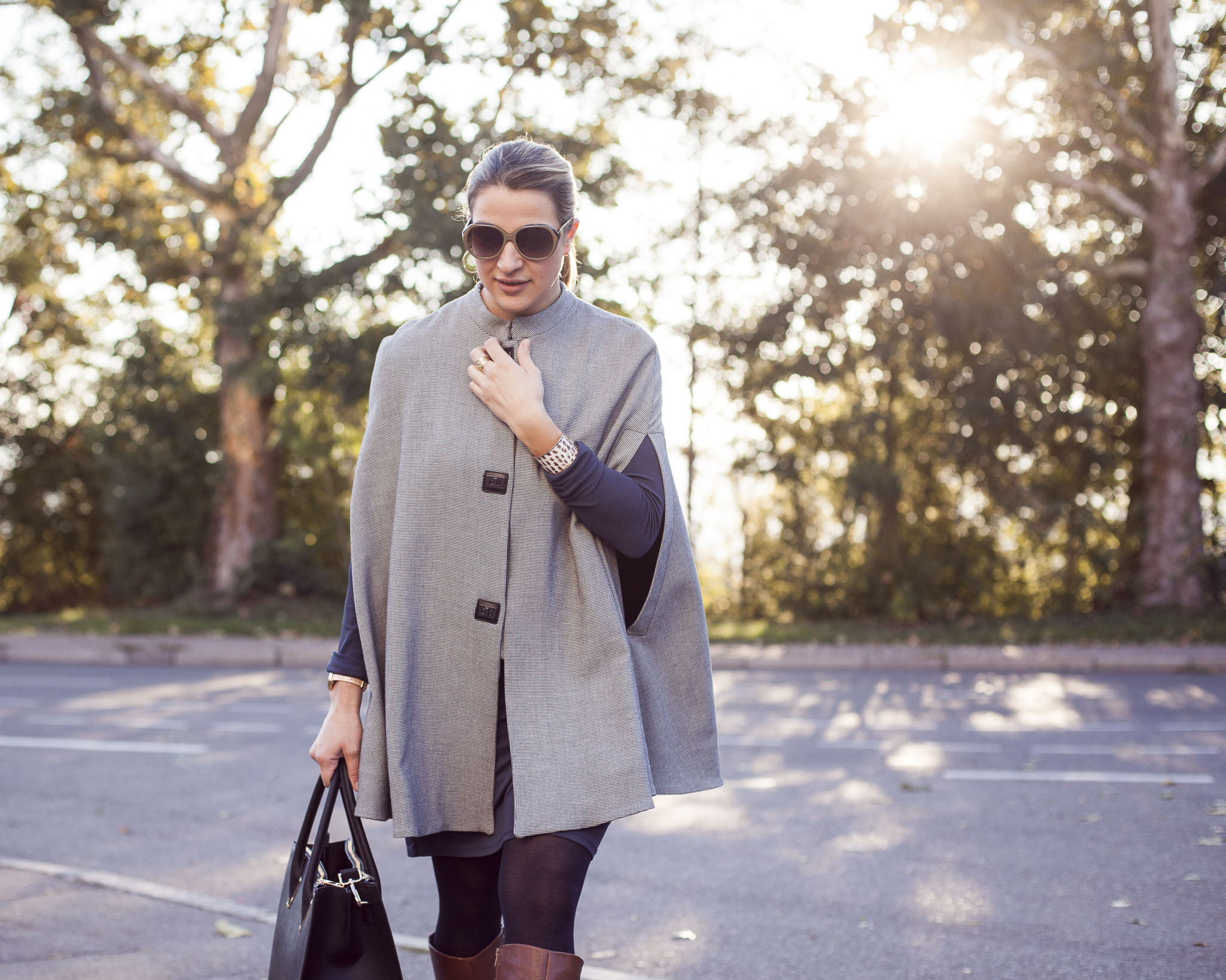 Cape: Mango, bag: H&M, sunglasses: Carolina Herrera