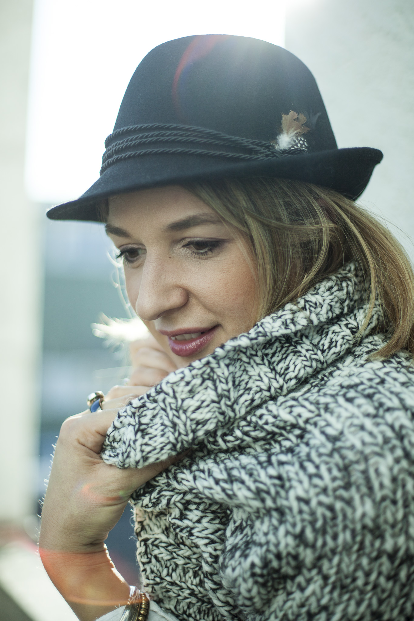 Hut: Staring at stars (Urban Outfitters); Bluse: Vila; Grobstrick-Jacke: Zabaione; Lederhose: Hallhuber